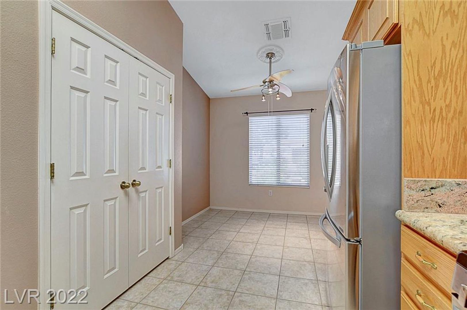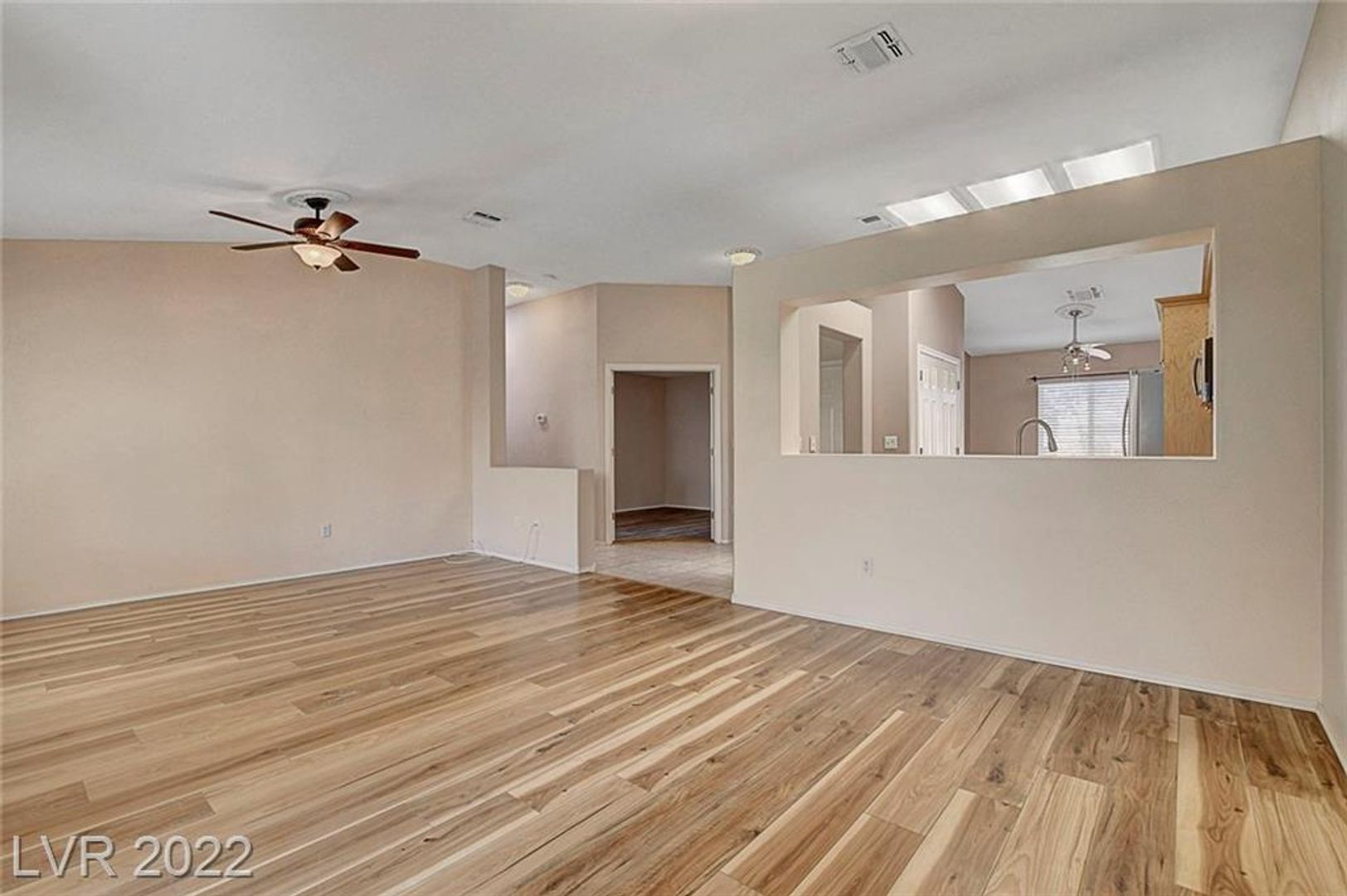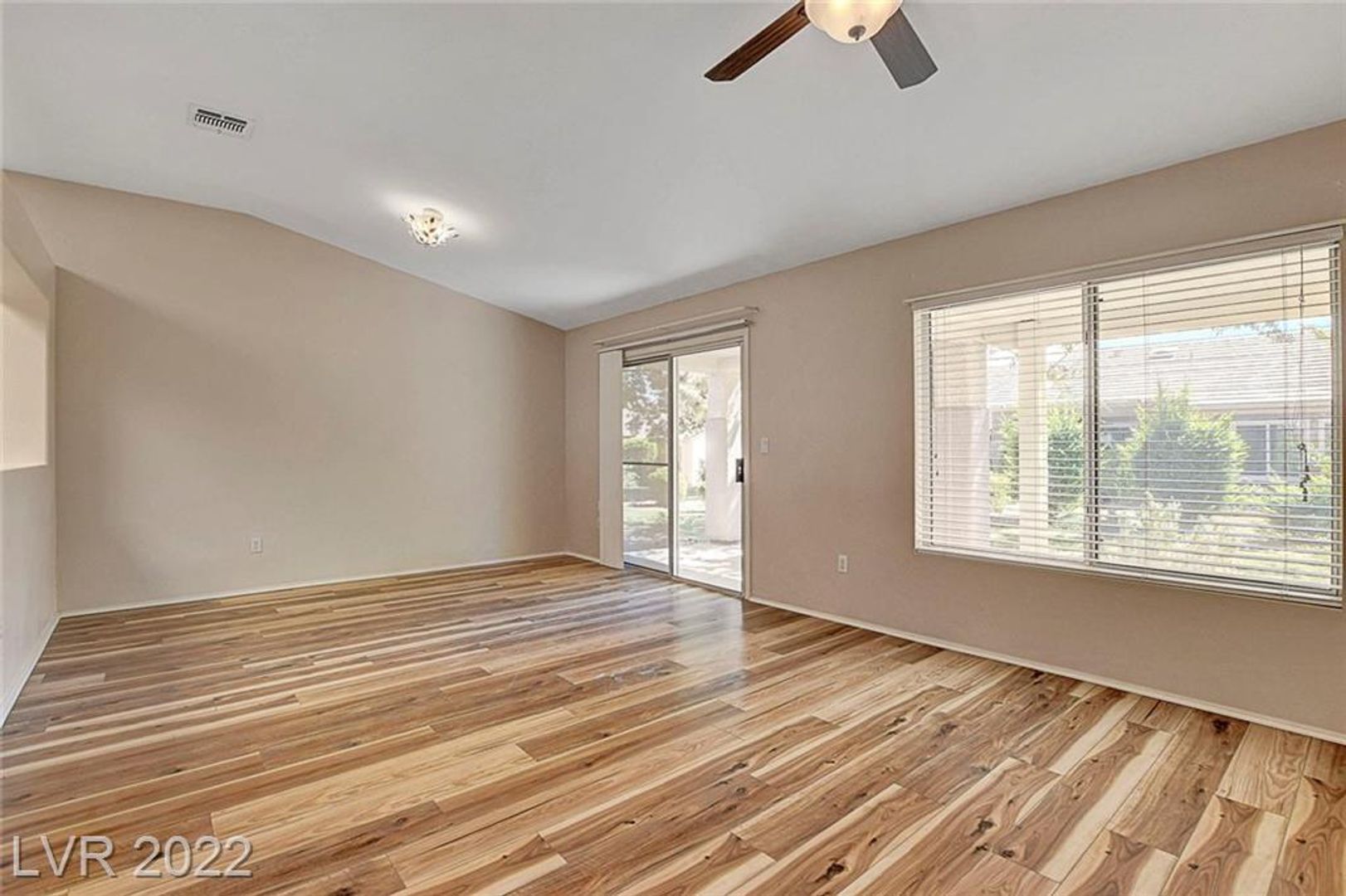 The open-concept main living space is perfect for entertaining, with vaulted ceilings and hard surface flooring throughout – no carpet here! A slider leads out to the extended covered patio, ideal for enjoying the outdoors, and ceiling fans keep you comfortable.