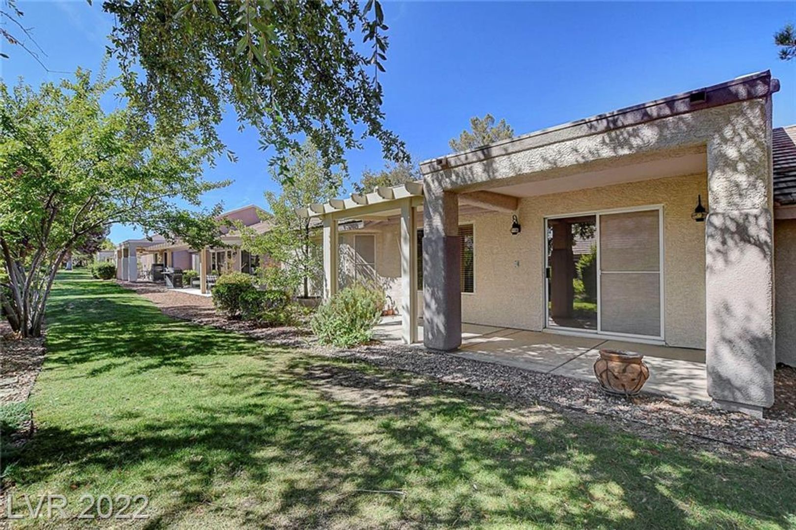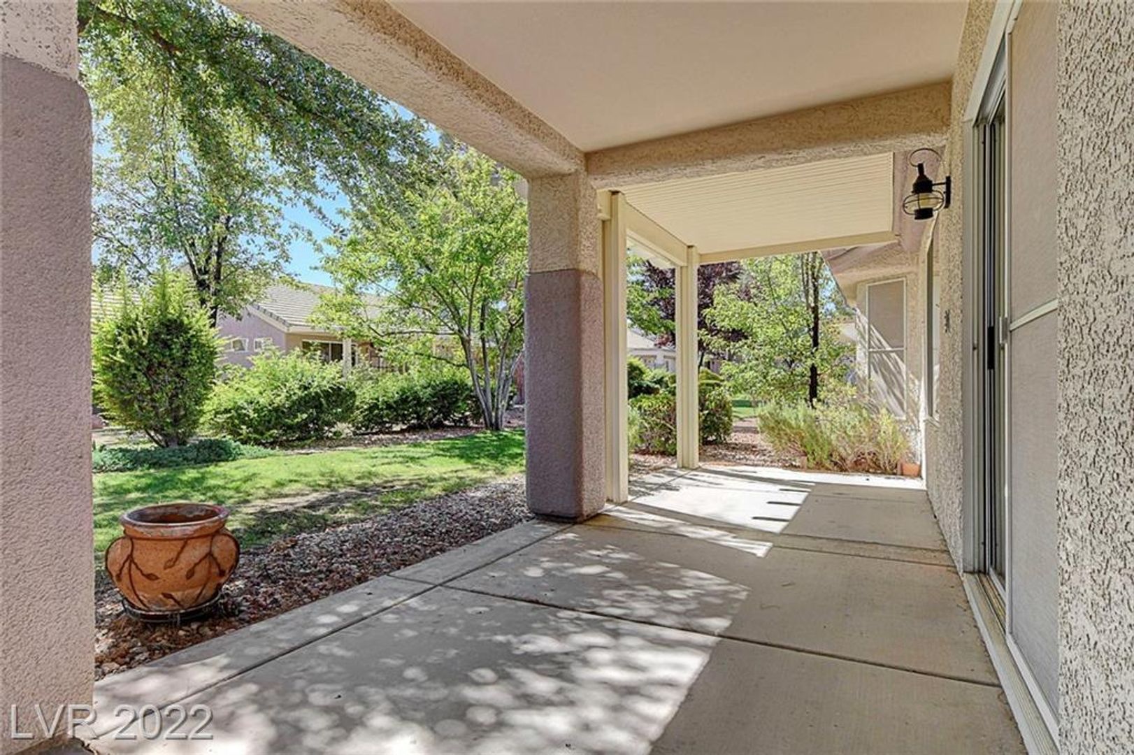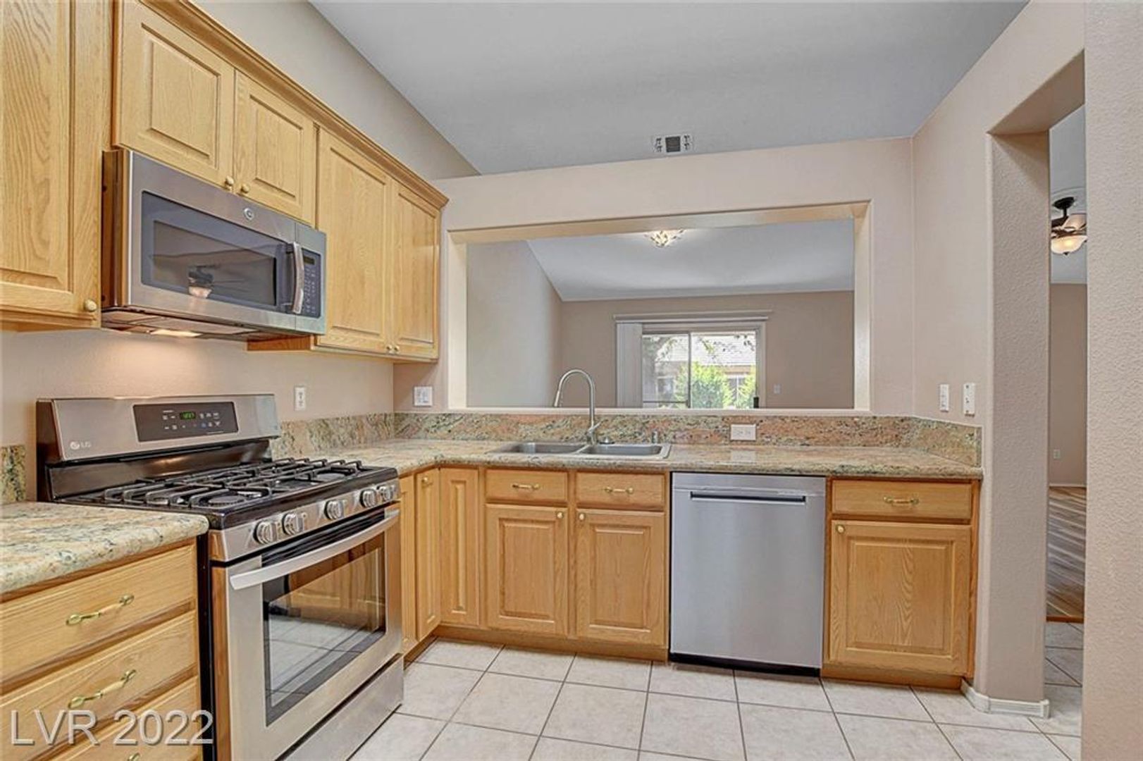 The open-concept main living space is perfect for entertaining, with vaulted ceilings and hard surface flooring throughout – no carpet here! A slider leads out to the extended covered patio, ideal for enjoying the outdoors, and ceiling fans keep you comfortable.