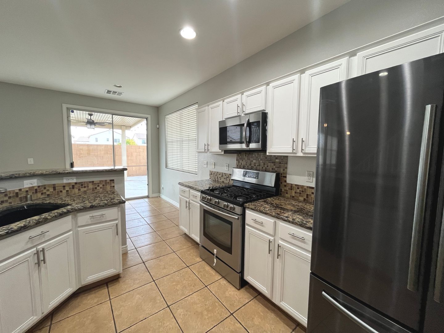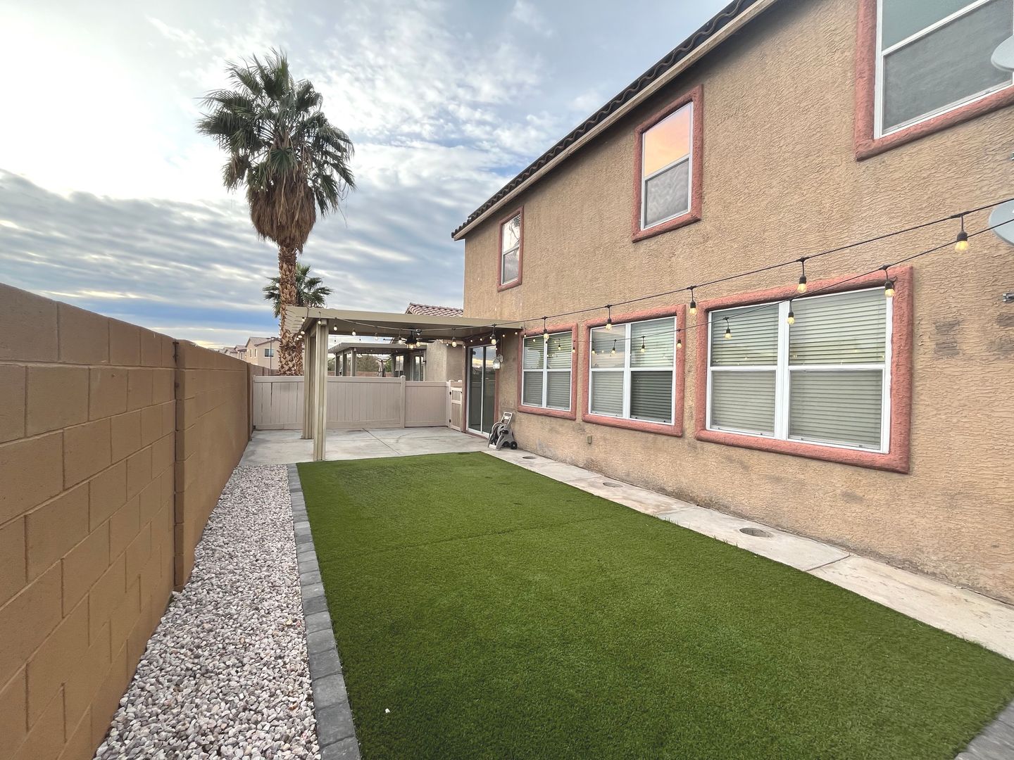 1847 sq ft, 2 story, 4 Bedroom, 2 1/2 bath, 2 Car Garage home in the Vibrant city of Las Vegas. This home boasts a range of modern amenities including solar panels for low power bill, a soft water system, alarm, new paint & new carpet. Formal Living room w/carpet & ceiling light. Kitchen w/breakfast bar w/granite countertops, tile backsplash, recessed lights, white cabinets, SS appliances, pantry & dining nook. Primary bedroom w/ceiling fan & light, carpet & walk in closet. Primary bathroom w/dual sinks, sep tub & shower, cultured marble tops, oak cabinets & tile floors. Bed 2 w/ ceiling fan & light and carpet. Bed 3 w/ceiling fan & light and laminate floors. Bed 4 w/ceiling fan & light and walk in closet. Bath 2 w/cultured marble counters, oak cabinets, tub/shower combo & tile floors. Backyard w/covered patio, w/ string lights, ceiling fan & light, syenthic grass & desert landscaping. Community has park and plenty of extra parking.