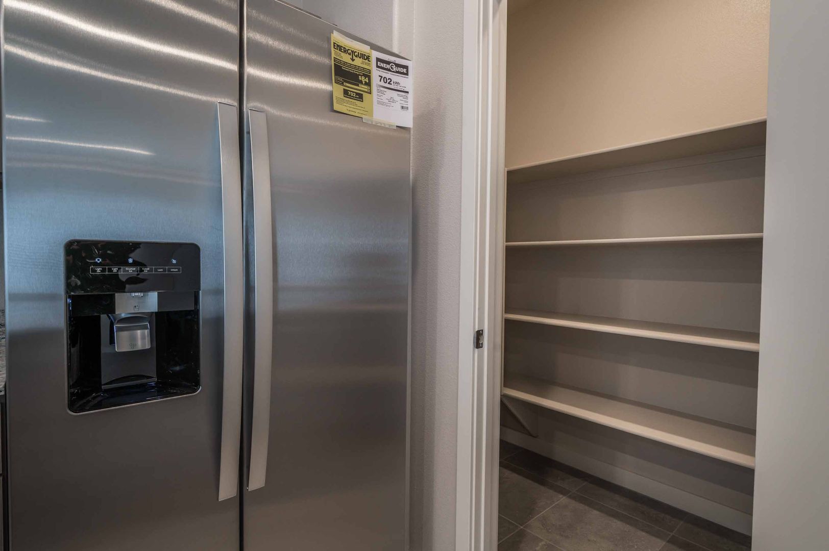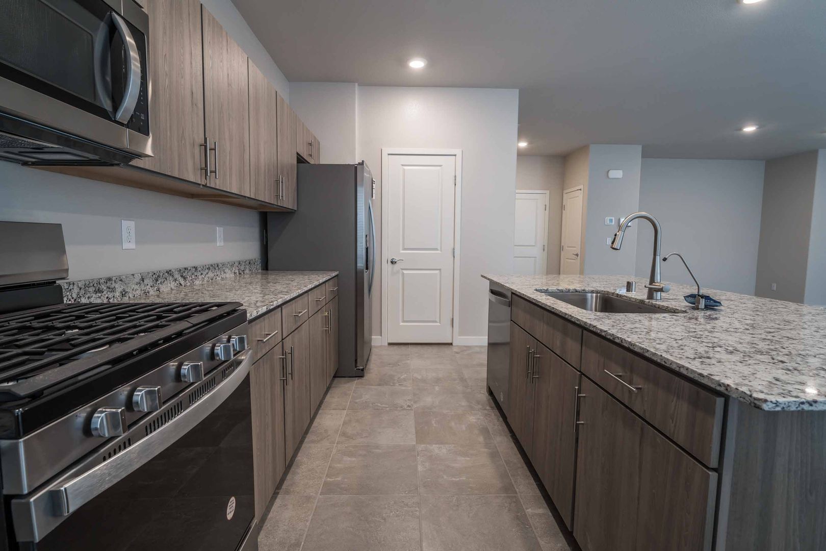 The stylish kitchen is designed to impress with cashmere gray cabinets with modern hardware, Dallas White granite countertops, stainless steel appliances (microwave, stove, and dishwasher), and a sleek under-mount single bowl sink.