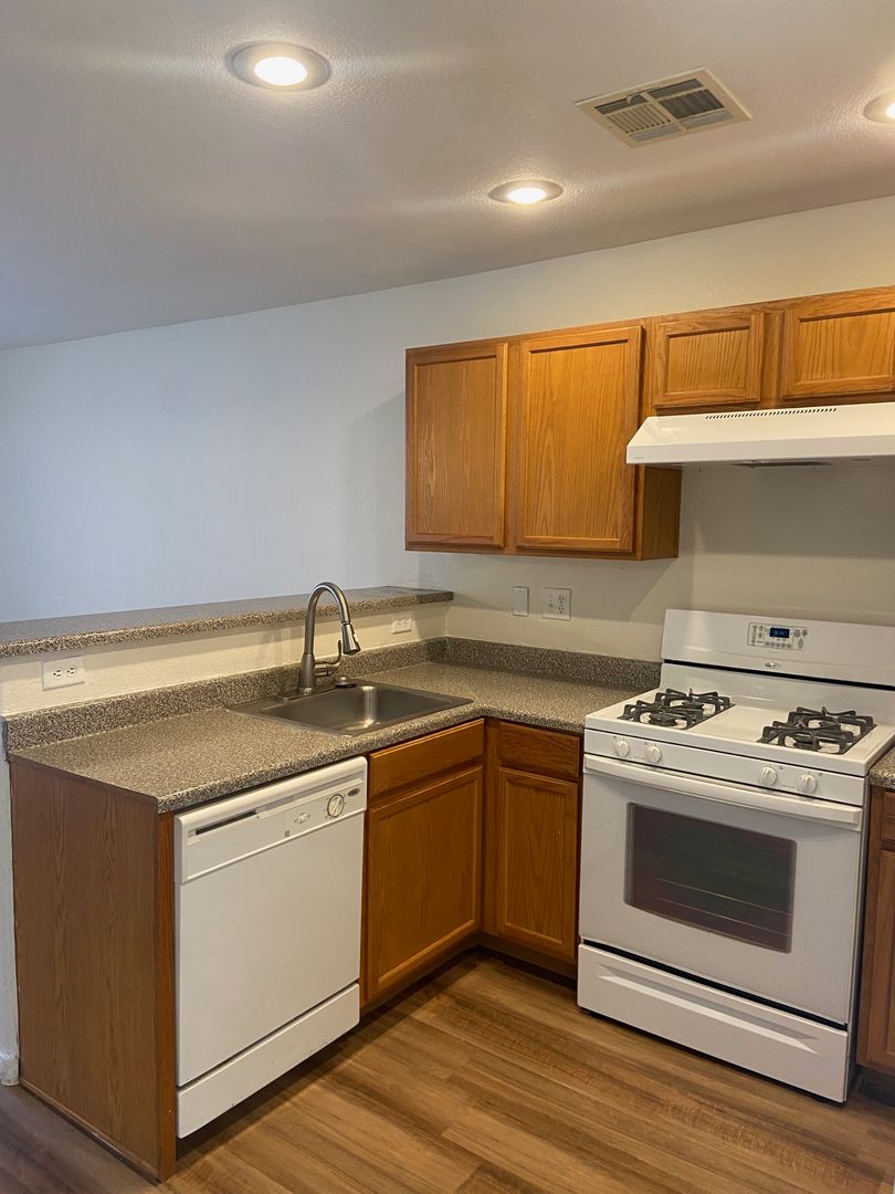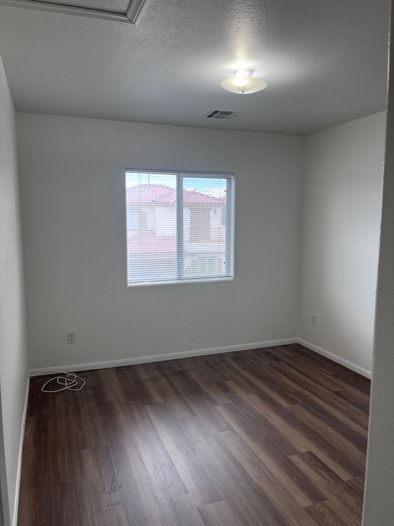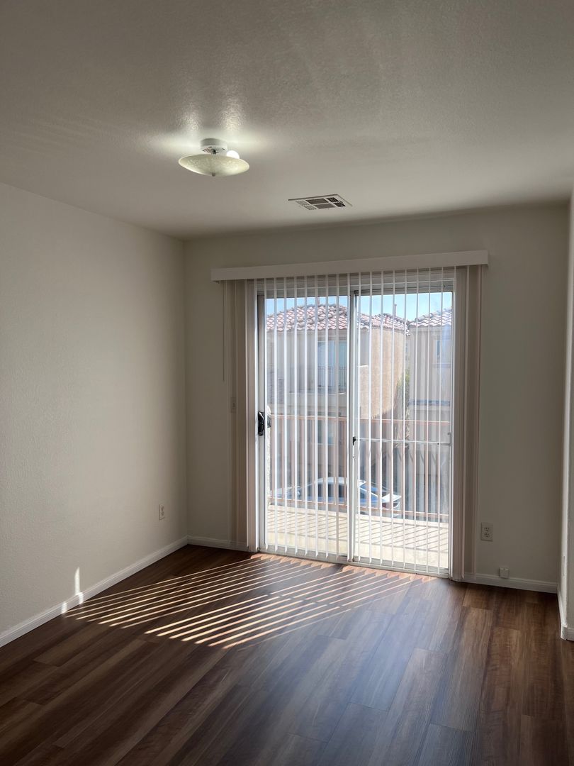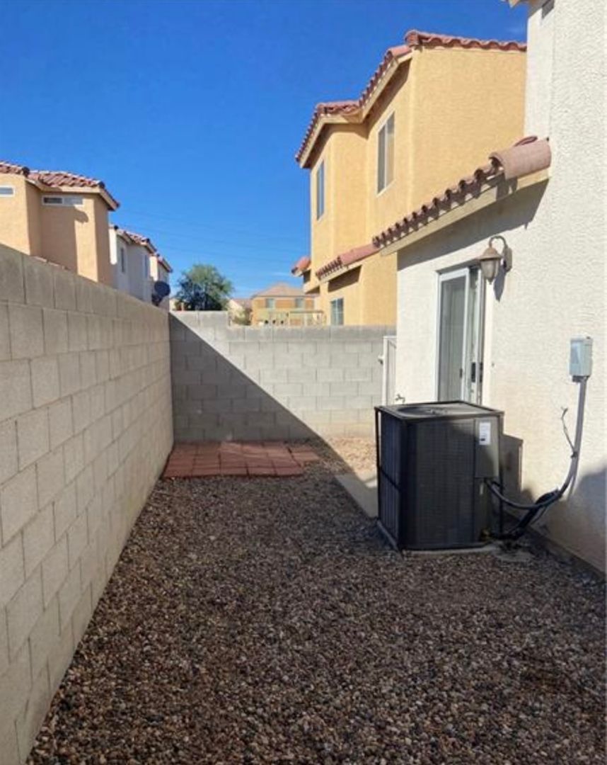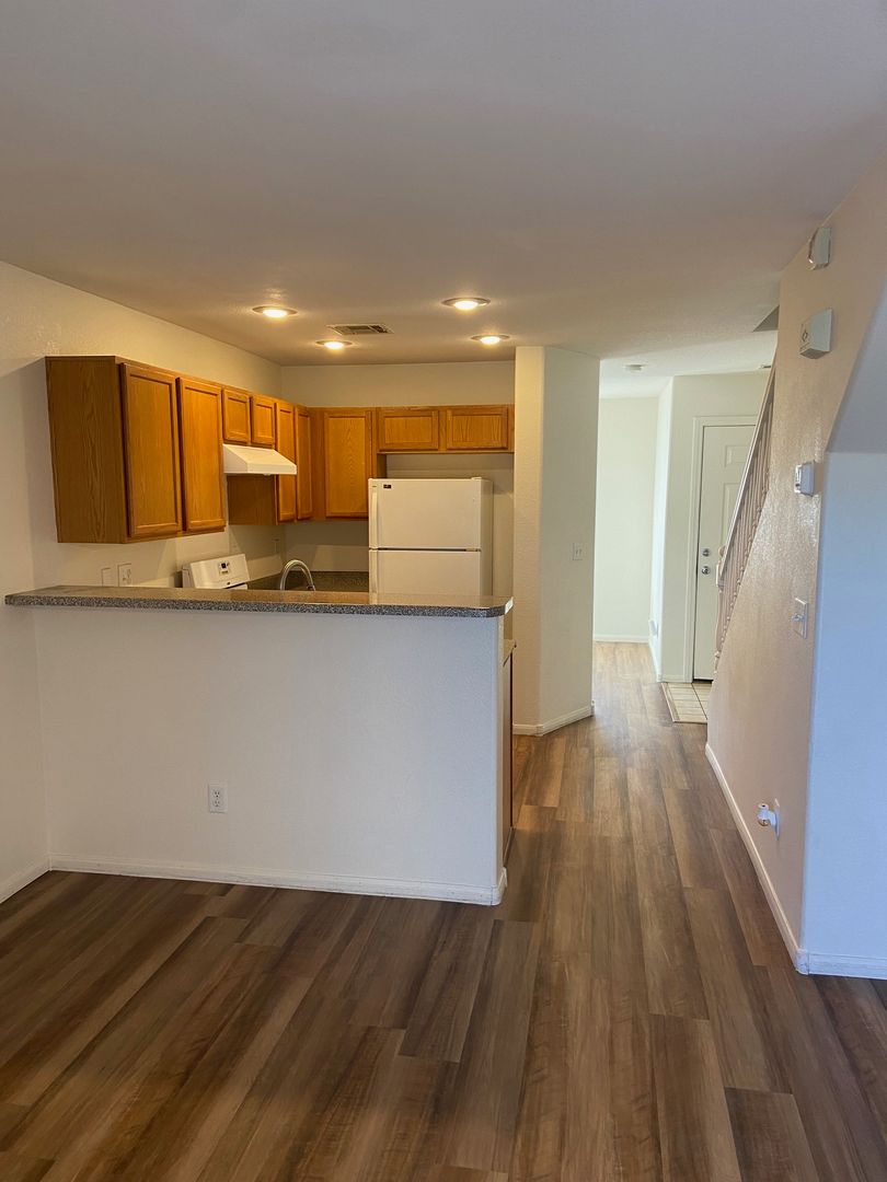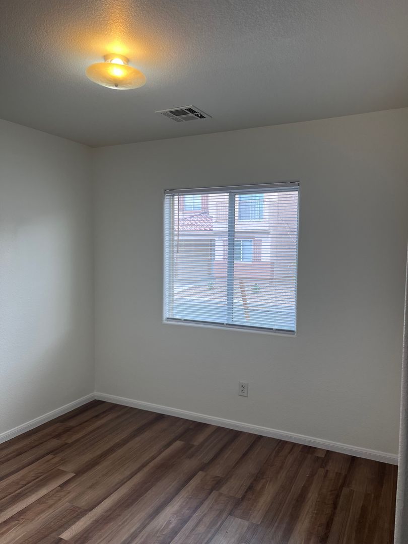 Nicely renovated and move-in ready, this charming 2-bedroom, 2.5-bath home is located in a gated community in North Las Vegas. The open-concept floor plan features fresh paint and stylish luxury plank flooring throughout, with new carpet on the stairs. The bright kitchen includes a breakfast bar and comes fully equipped with all appliances, including a full-size washer and dryer. Each bedroom offers its own private full bathroom, and a convenient half-bath is located downstairs for guests. The primary bedroom also features private balcony access—perfect for relaxing outdoors. A one-car garage with a full driveway adds extra convenience and has been freshly painted. One small dog will be considered with an additional deposit. Home includes private fenced in backyard. Available for immediate move. Schedule your showing appointment, available Saturday!