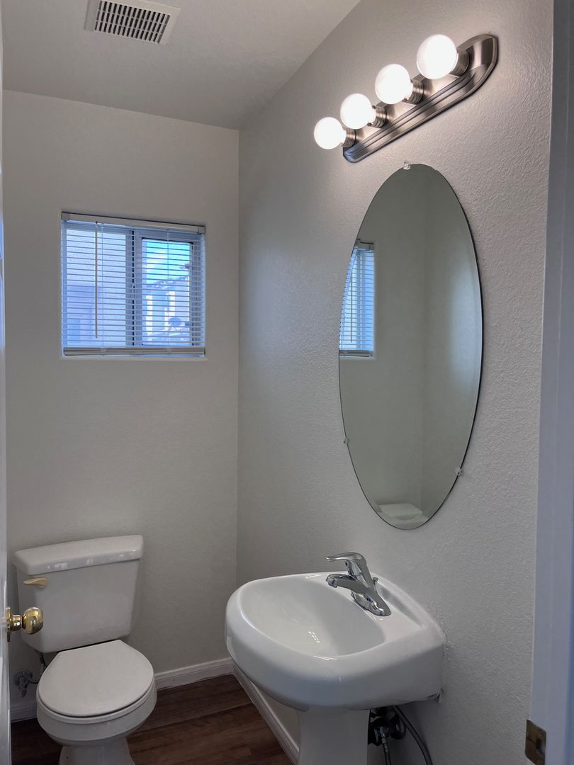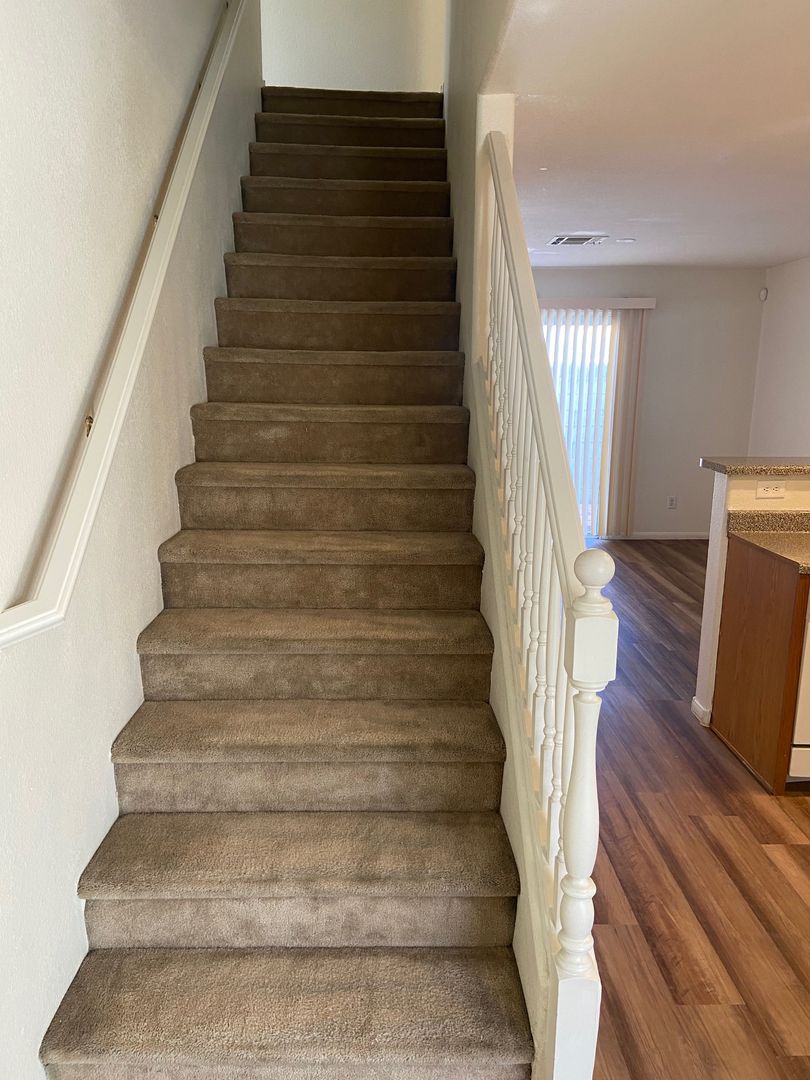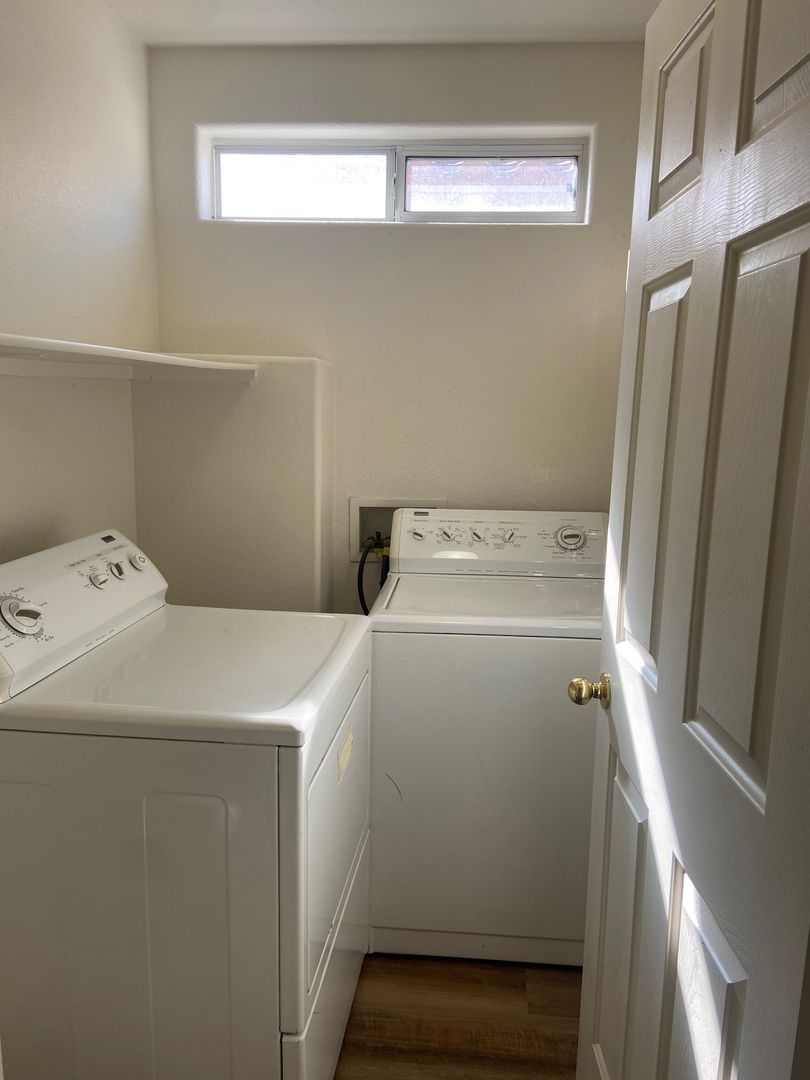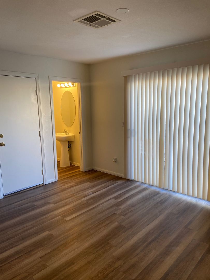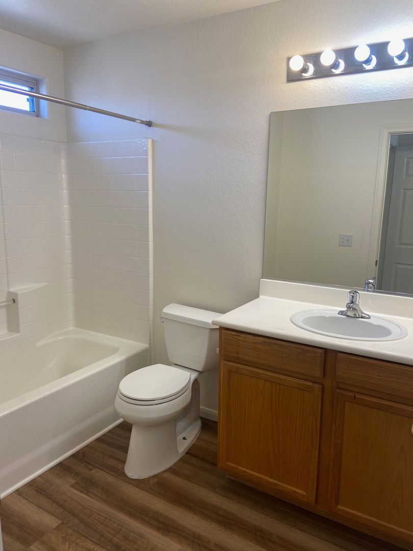 Nicely renovated and move-in ready, this charming 2-bedroom, 2.5-bath home is located in a gated community in North Las Vegas. The open-concept floor plan features fresh paint and stylish luxury plank flooring throughout, with new carpet on the stairs. The bright kitchen includes a breakfast bar and comes fully equipped with all appliances, including a full-size washer and dryer. Each bedroom offers its own private full bathroom, and a convenient half-bath is located downstairs for guests. The primary bedroom also features private balcony access—perfect for relaxing outdoors. A one-car garage with a full driveway adds extra convenience and has been freshly painted. One small dog will be considered with an additional deposit. Home includes private fenced in backyard. Available for immediate move. Schedule your showing appointment, available Saturday!