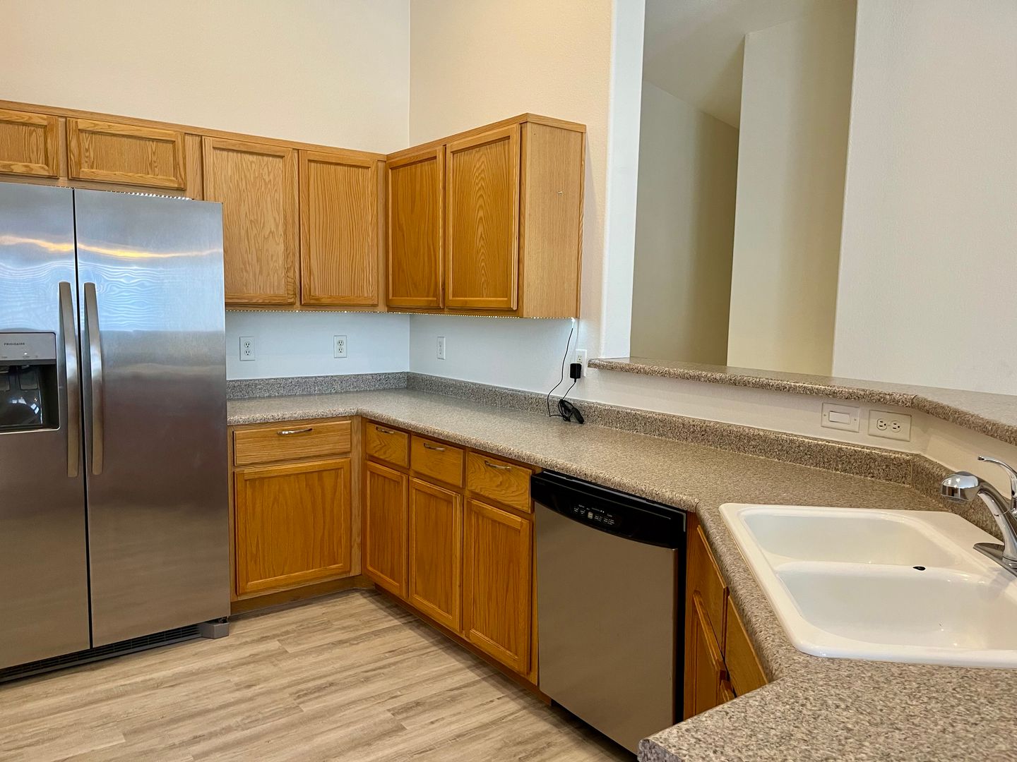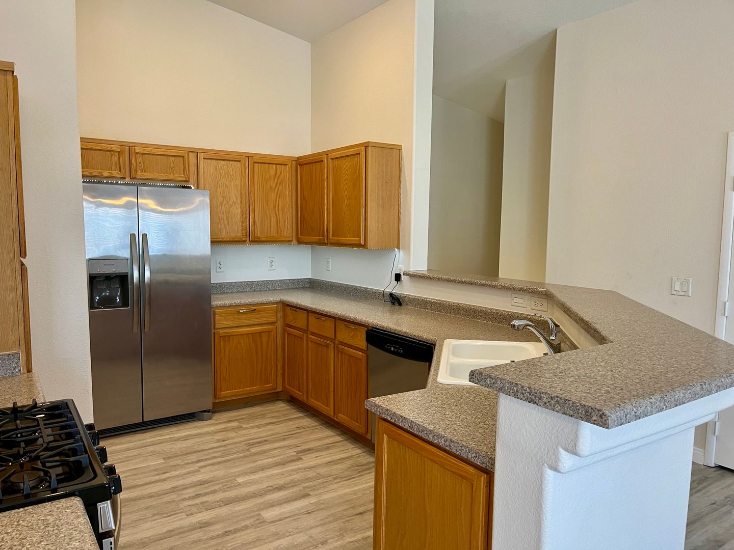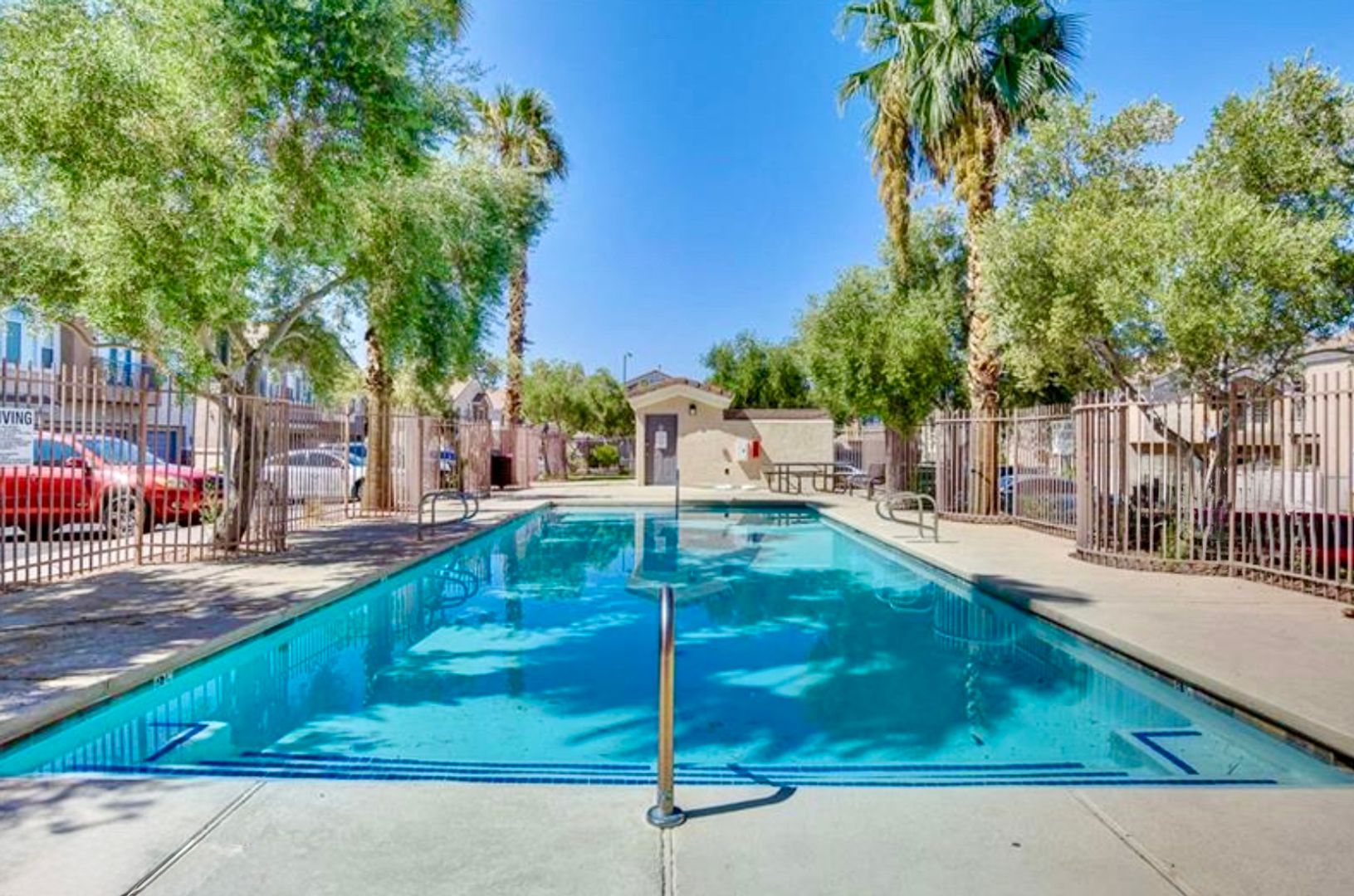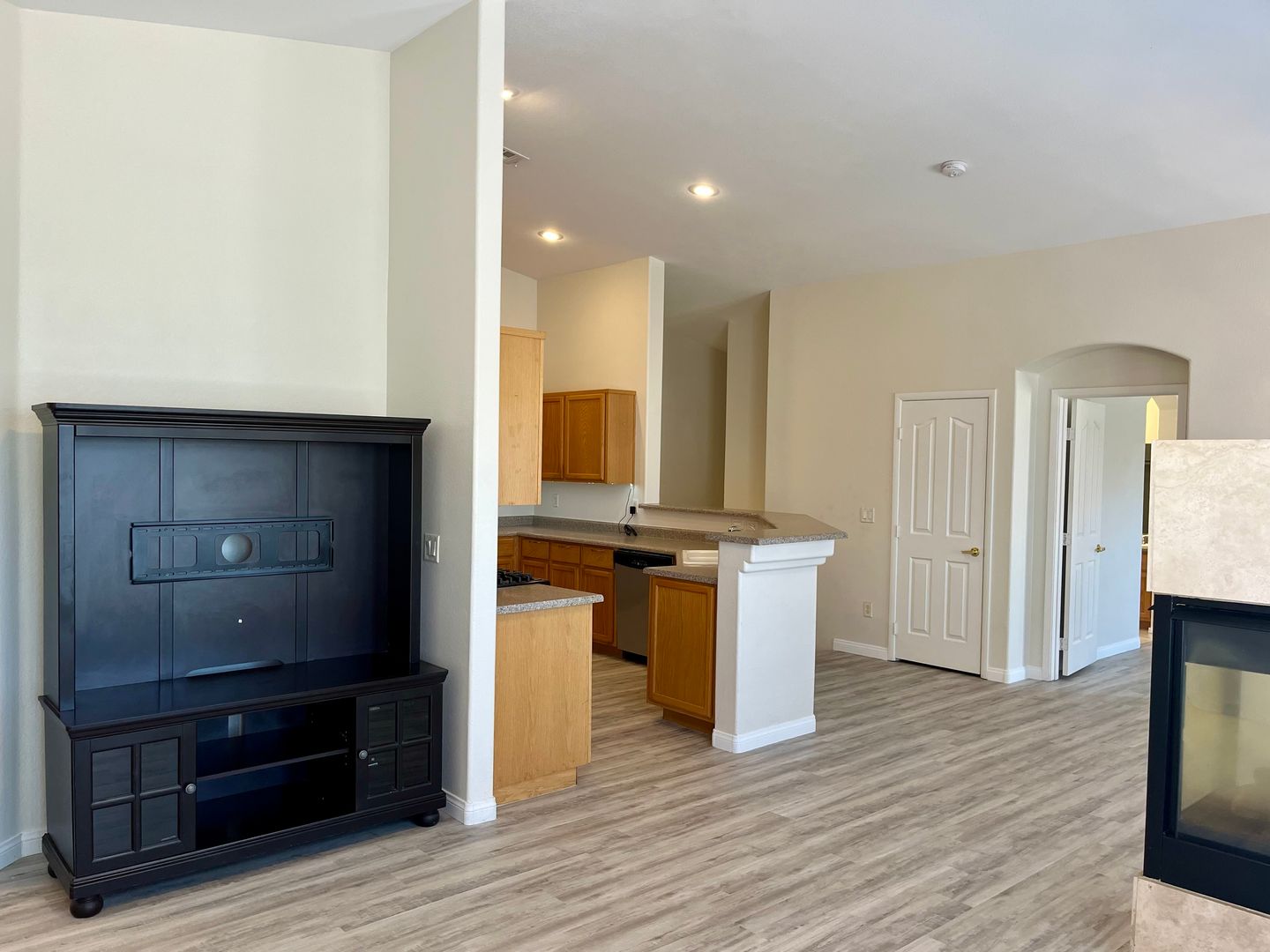 Advertised rent includes all monthly fixed charges. Welcome to this charming 2 Bedroom, 2 bath, 1 car garage Townhome in a gated community in the heart of Henderson! With vaulted ceilings, balcony, ceiling fans & new man-made luxury vinyl plank floors throughout and new AC, this home is move-in ready. The lovely kitchen is comprised of oak cabinetry w/breakfast bar w/ample counter space, laminate counters, pantry, recessed lighting & Stainless Steel appliances. Dining nook with french doors to the balcony and cozy 3 way gas fireplace separating dining & living room w/ceiling fan & light. Primary bedroom, featuring its own ensuite, ceiling fan & light and walk-in closet. Primary bath with walk in shower. Bed 2 is separate from primary with ceiling fan & light. Bath 2 with tub/shower combo. Gated community with pool, park, playground with greenbelt! The home is nestled in a prime location near schools, shopping, freeways, and entertainment! Don't miss out on this incredible opportunity to live in Henderson! $1,700 base rent + $35 trash = $1,735 periodic rent.