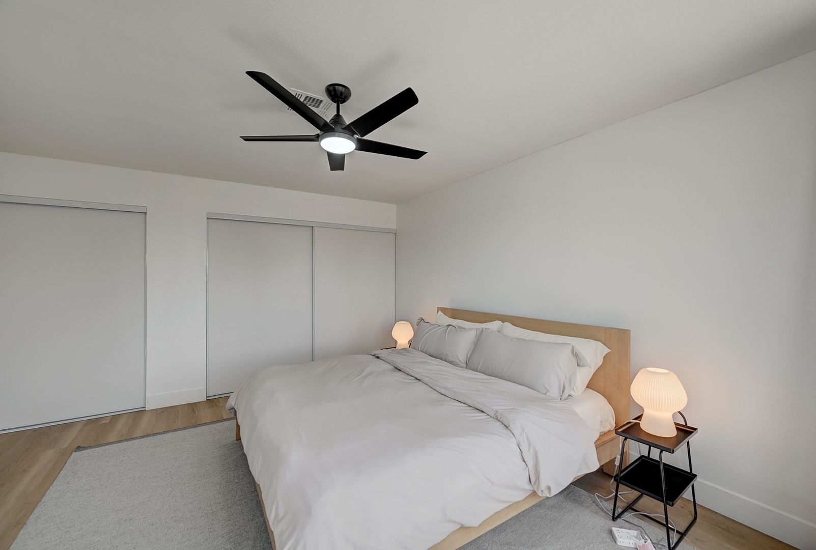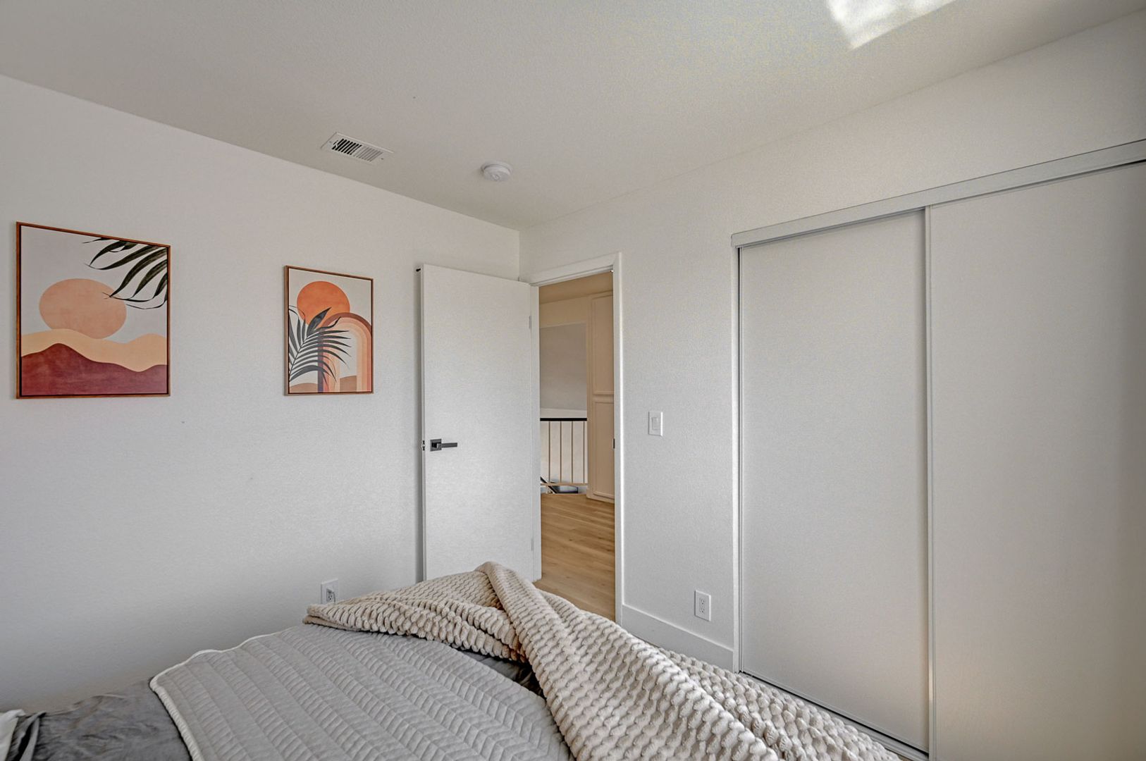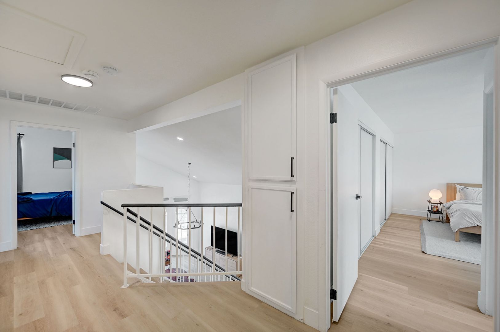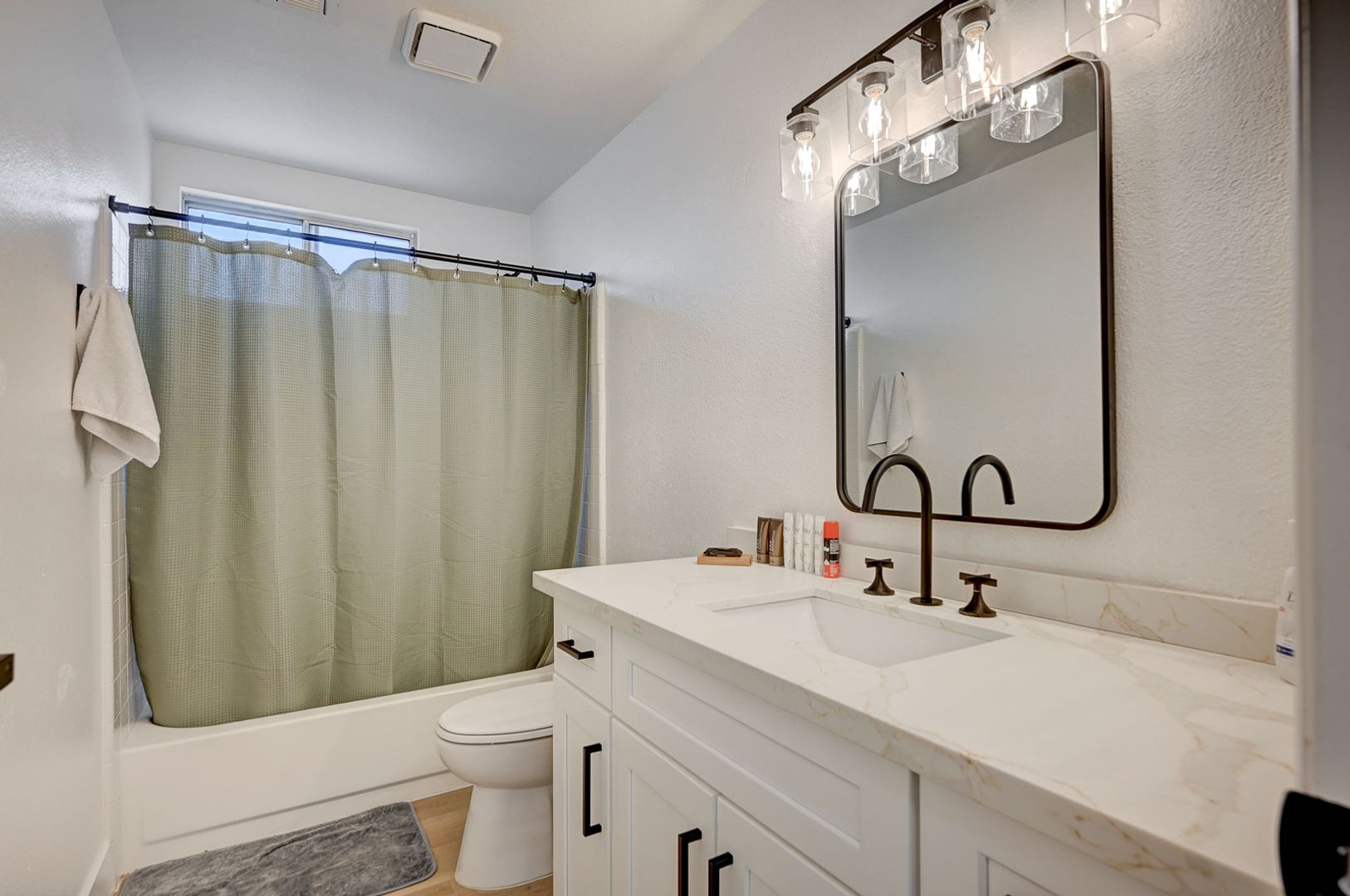 The modern kitchen boasts crisp white shaker cabinetry and sleek quartz countertops, while the primary suite includes a spa-inspired bathroom with a fully tiled shower and a black-framed glass slider, combining timeless design with contemporary flair.
