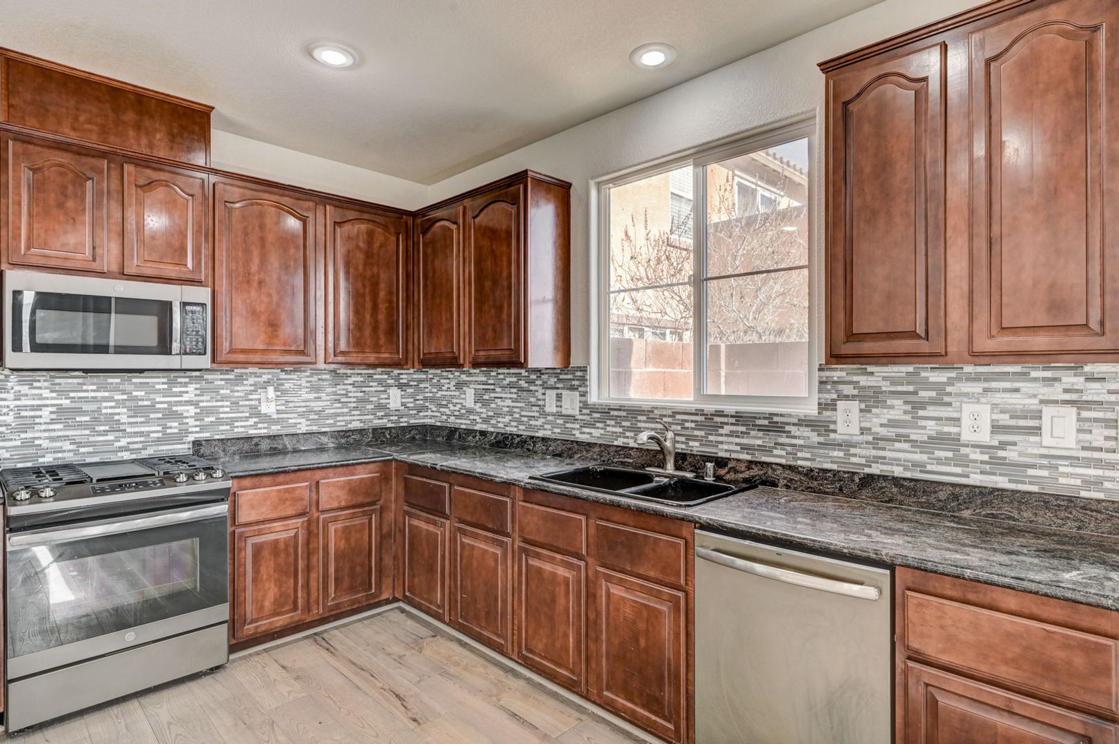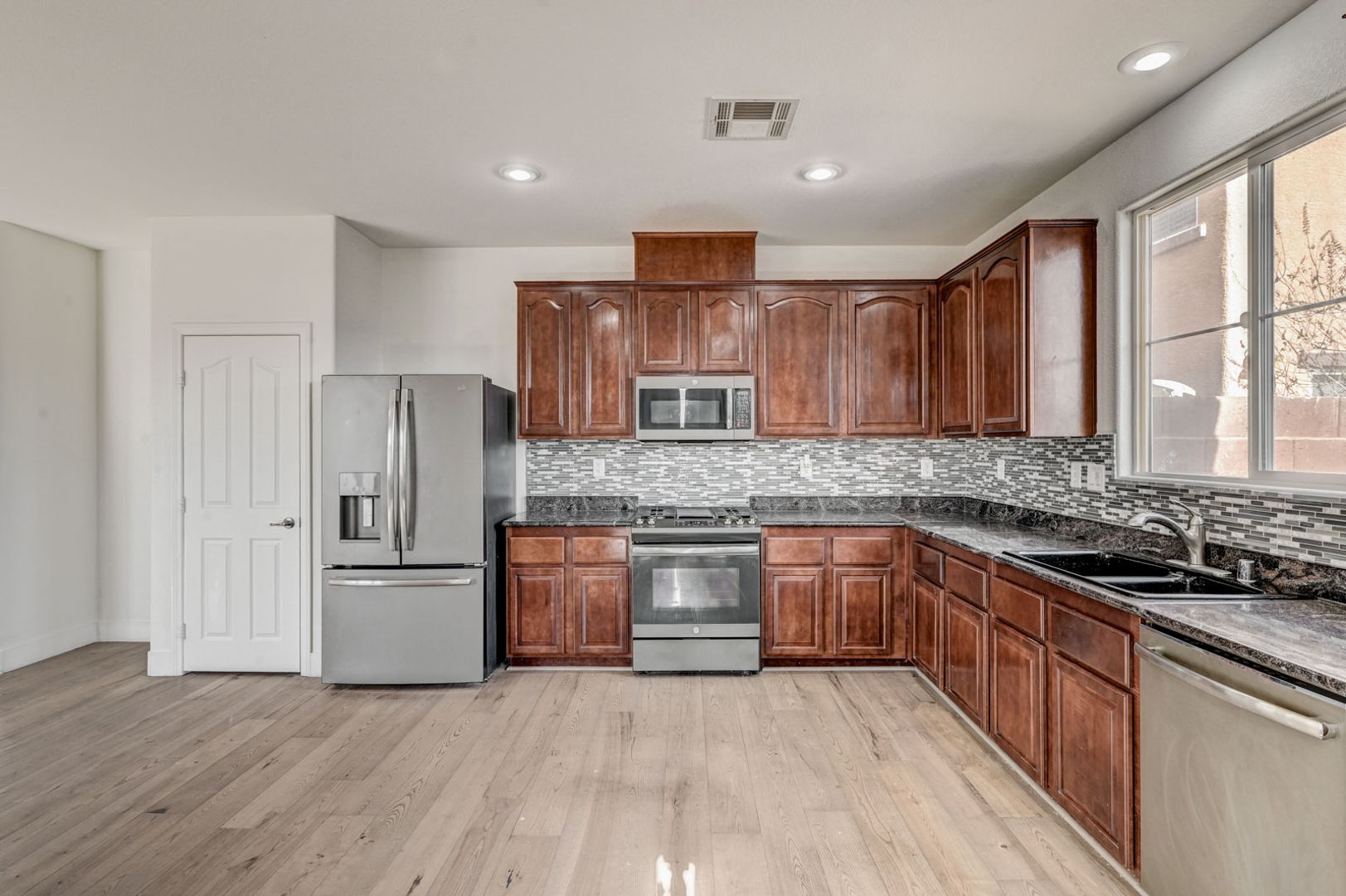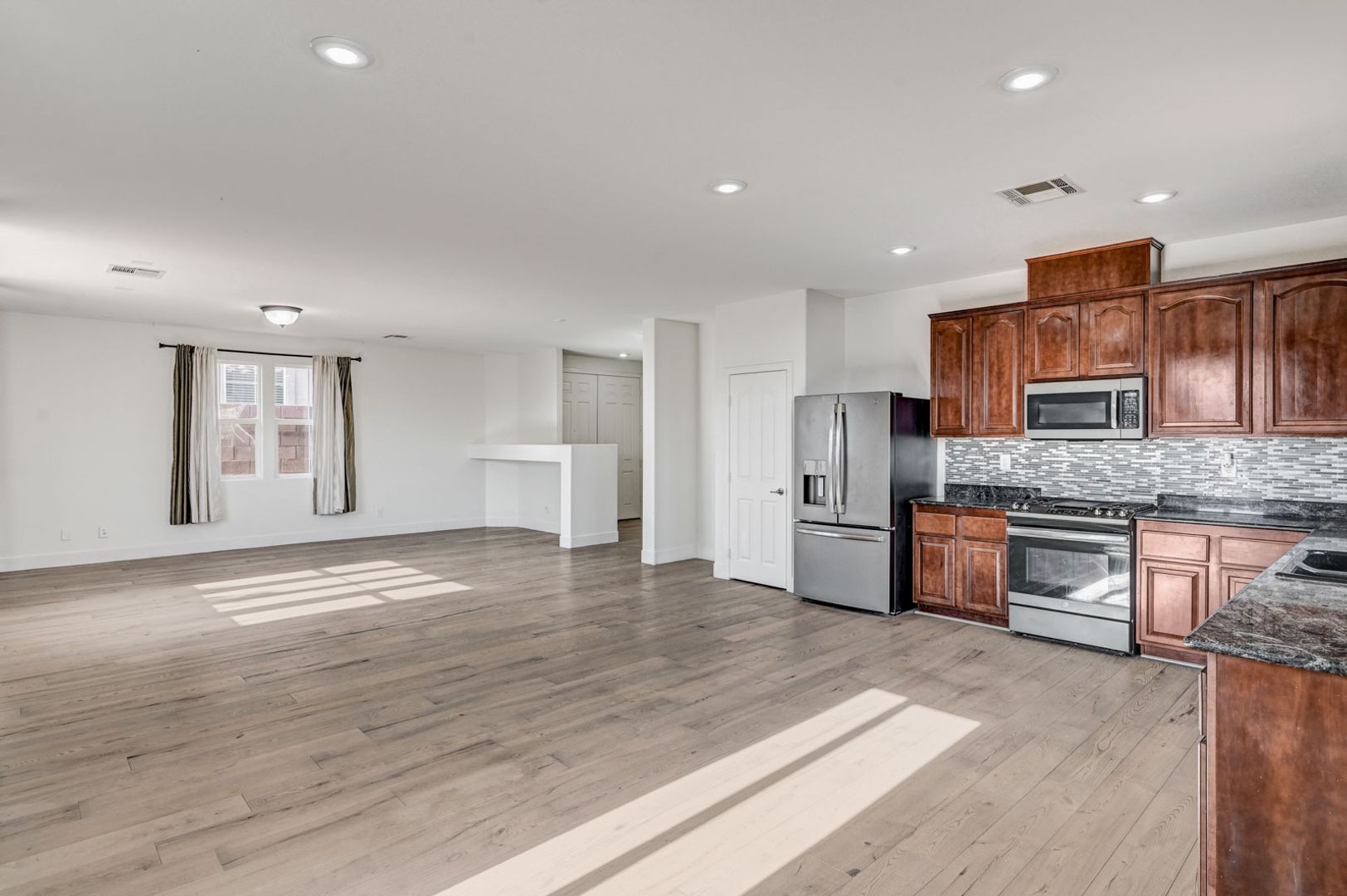 Welcome home to this spacious single-story residence located in the sought-after Chaco Canyon community of Mountain’s Edge. Enjoy convenient access to nearby shopping, dining, and everyday essentials while living in a beautifully planned neighborhood. This 4-bedroom home features a bright, open layout filled with natural sunlight and luxury vinyl plank flooring throughout. The kitchen is equipped with stainless steel appliances and flows seamlessly into the main living areas—perfect for both daily living and entertaining. The primary suite offers a generous walk-in closet and a spa-like bathroom with dual sinks and a separate soaking tub and shower. Step outside to a low-maintenance backyard with paver patio, ideal for relaxing or hosting guests. Comfort, style, and location come together in this Mountain’s Edge gem.