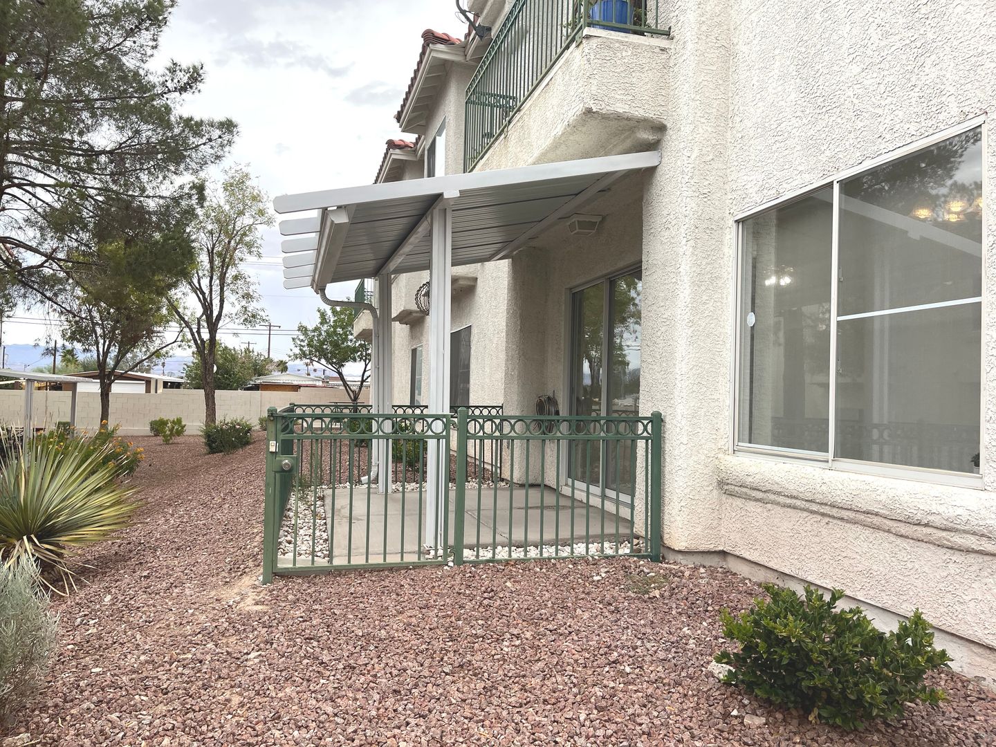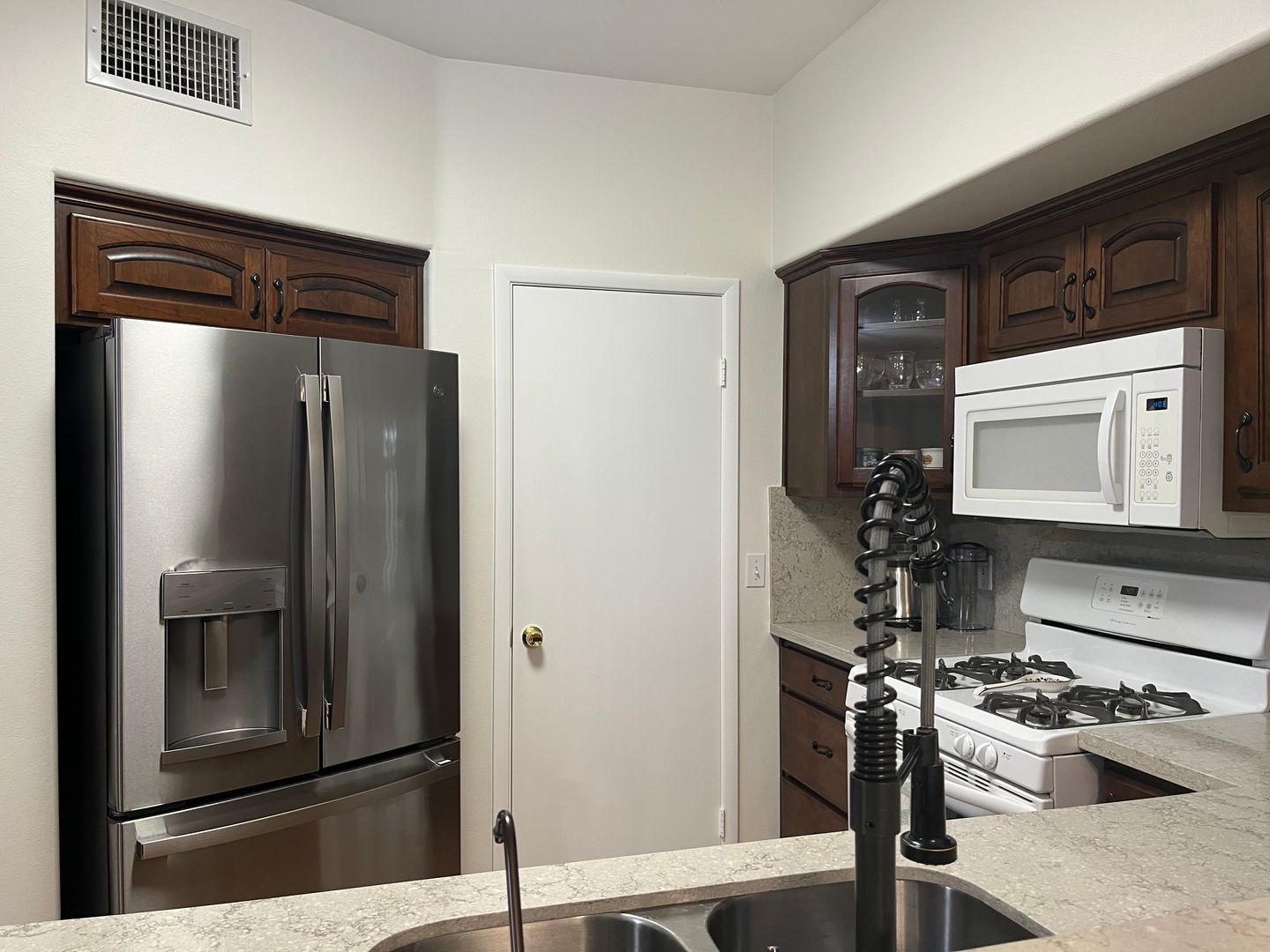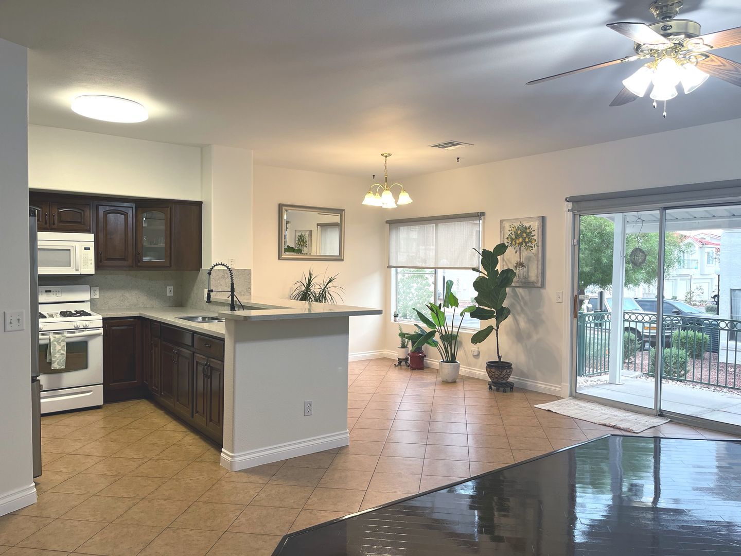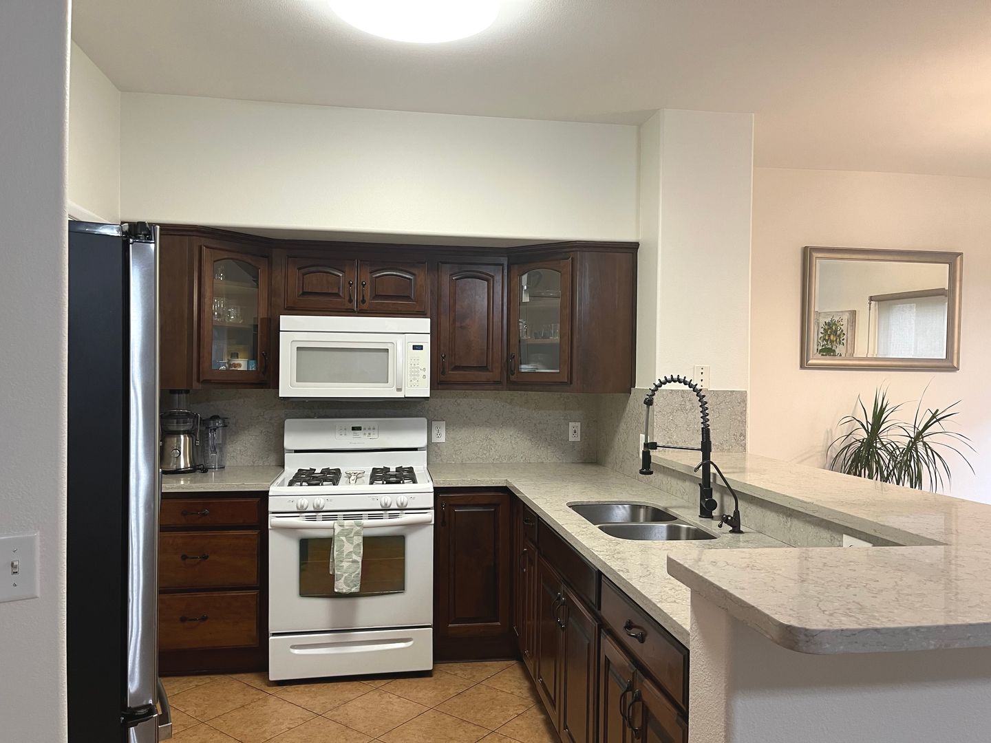 Advertised rent includes all monthly fixed charges. Remodeled, first floor 1428 sq ft, 2 bed+ den, 2 bath, 1 car detached garage condo in gated community. AC & water heater were replaced in 2020 & house is newly painted. Kitchen w/breakfast bar w/granite counters, full granite backsplash, raised custom cabinets w/soft close doors & drawers, ceramic tile floors, new SS refrigerator, white stove µowave, walk in pantry & dining nook. Living room w/ceiling fan & light, wood laminate floors & brick niche w/slider to outdoor covered patio. Primary bed w/ceiling fan & light, wood laminate floors & walk in closet. Primary bath w/dual sinks, granite countertops, travertine tile backsplash, linen closet & tub/shower combo w/travertine tile surround. Bed 2 w/ceiling fan & light, wood laminate floors & closet. Bath 2 w/tile floors, granite counters & tub/shower combo w/travertine tile surround. Den w/ceiling fan & light & wood laminate floors. Covered patio w/concrete slab and wrought iron railing. Detached 1 car garage w/walkway to front door.