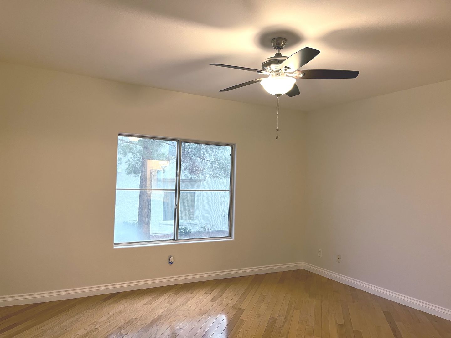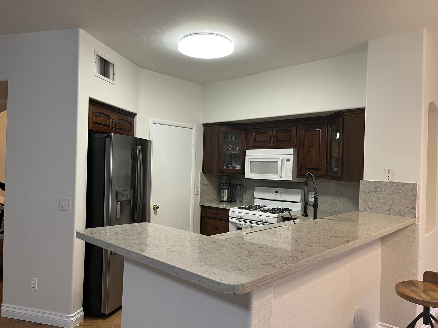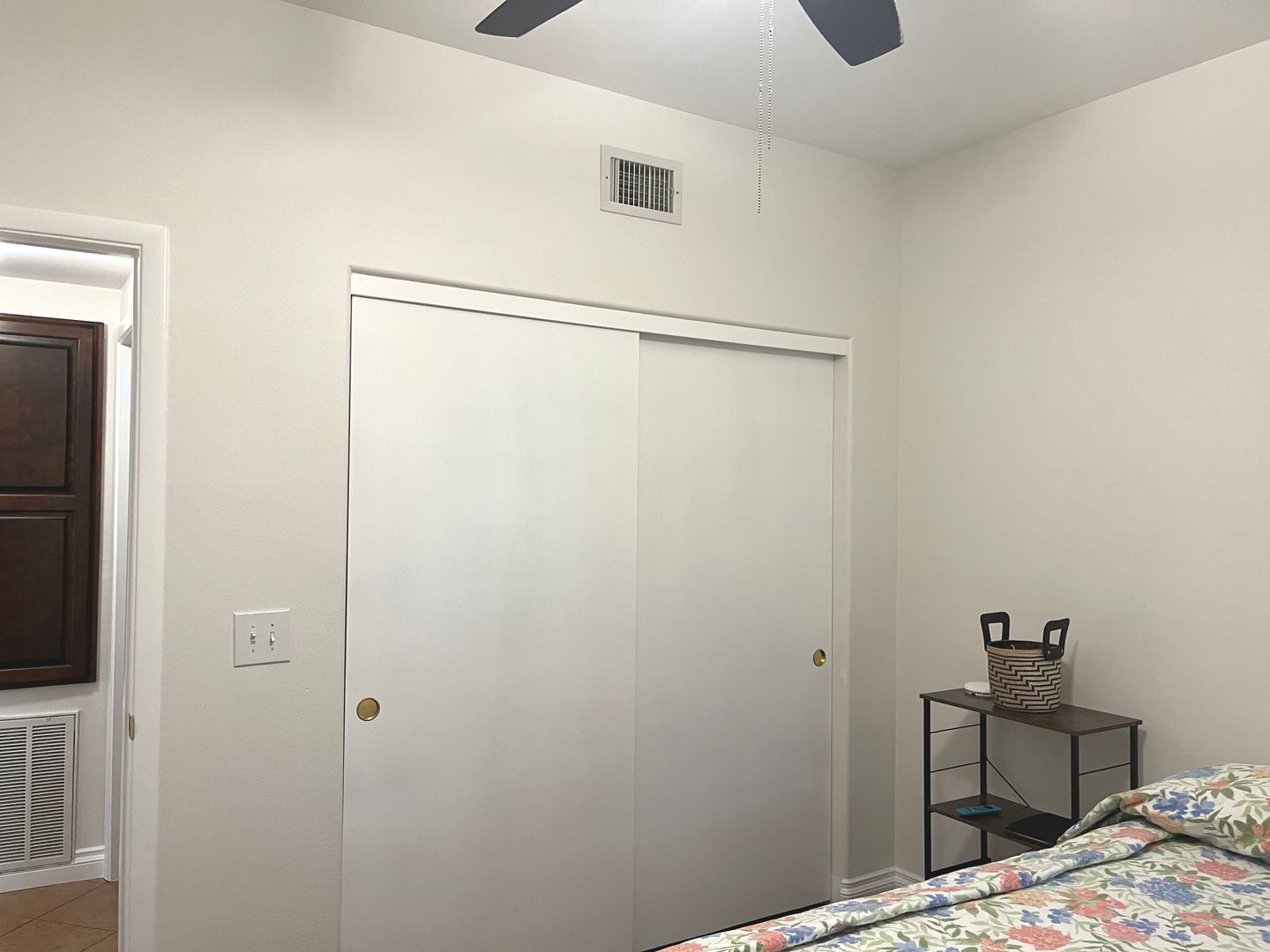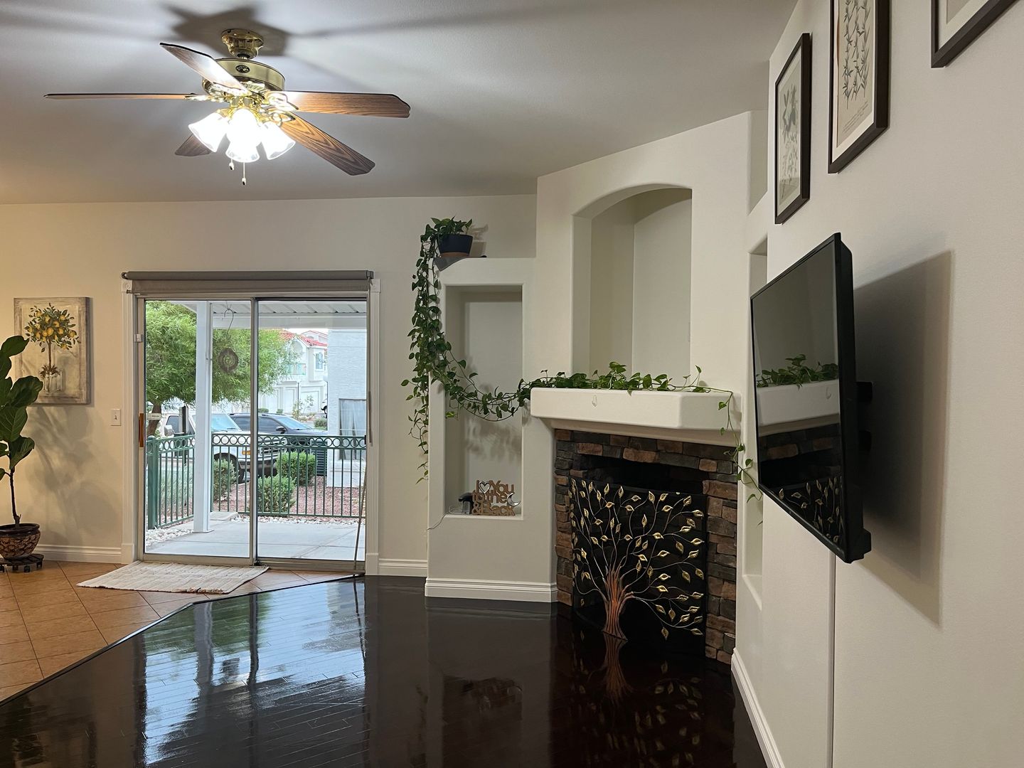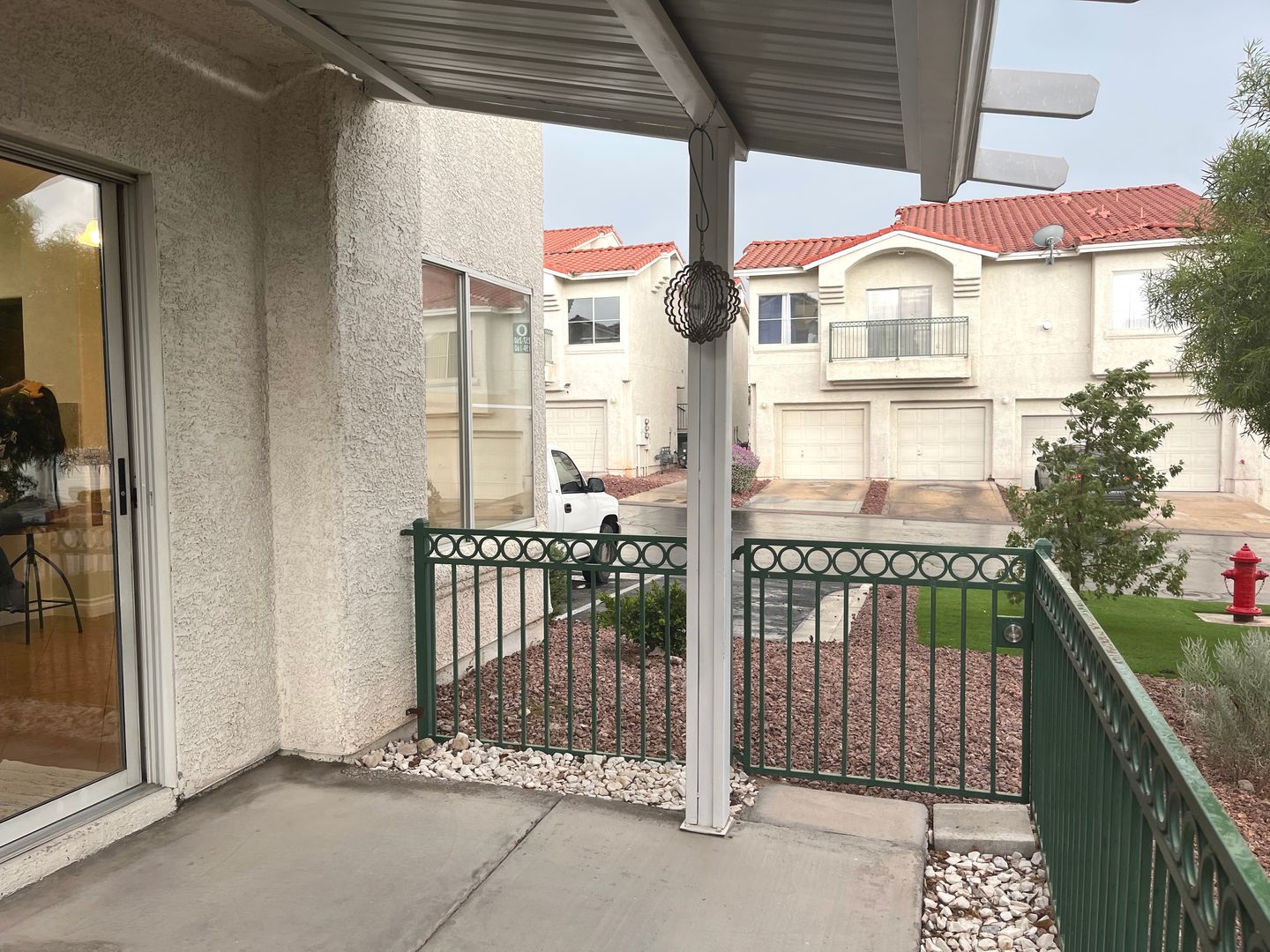 Advertised rent includes all monthly fixed charges. Remodeled, first floor 1428 sq ft, 2 bed+ den, 2 bath, 1 car detached garage condo in gated community. AC & water heater were replaced in 2020 & house is newly painted. Kitchen w/breakfast bar w/granite counters, full granite backsplash, raised custom cabinets w/soft close doors & drawers, ceramic tile floors, new SS refrigerator, white stove µowave, walk in pantry & dining nook. Living room w/ceiling fan & light, wood laminate floors & brick niche w/slider to outdoor covered patio. Primary bed w/ceiling fan & light, wood laminate floors & walk in closet. Primary bath w/dual sinks, granite countertops, travertine tile backsplash, linen closet & tub/shower combo w/travertine tile surround. Bed 2 w/ceiling fan & light, wood laminate floors & closet. Bath 2 w/tile floors, granite counters & tub/shower combo w/travertine tile surround. Den w/ceiling fan & light & wood laminate floors. Covered patio w/concrete slab and wrought iron railing. Detached 1 car garage w/walkway to front door.