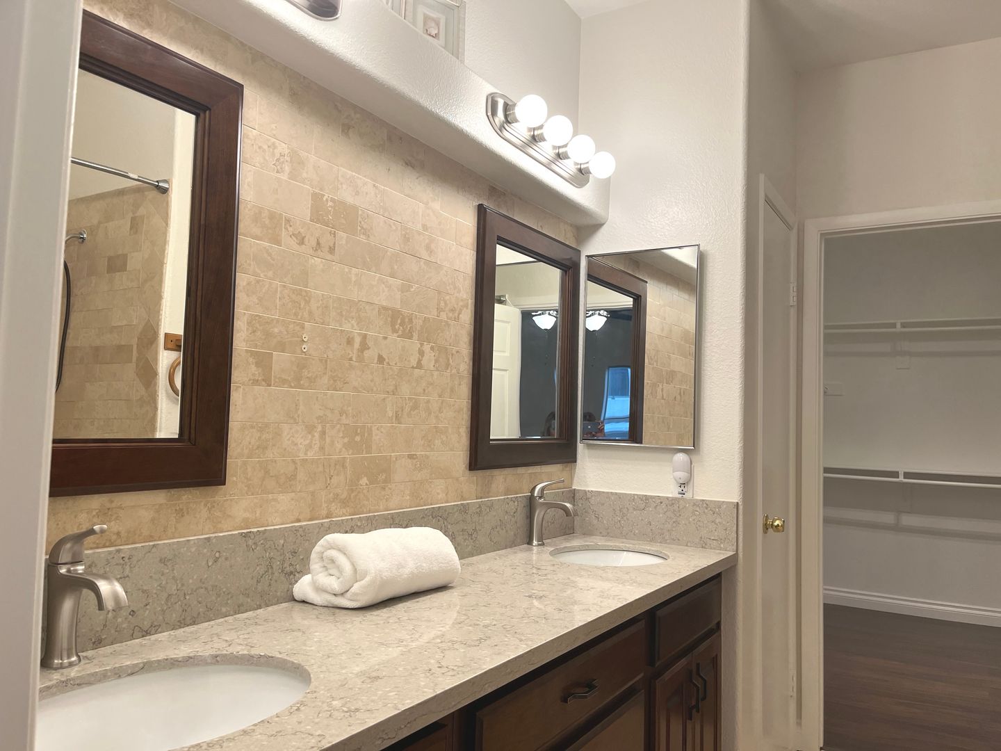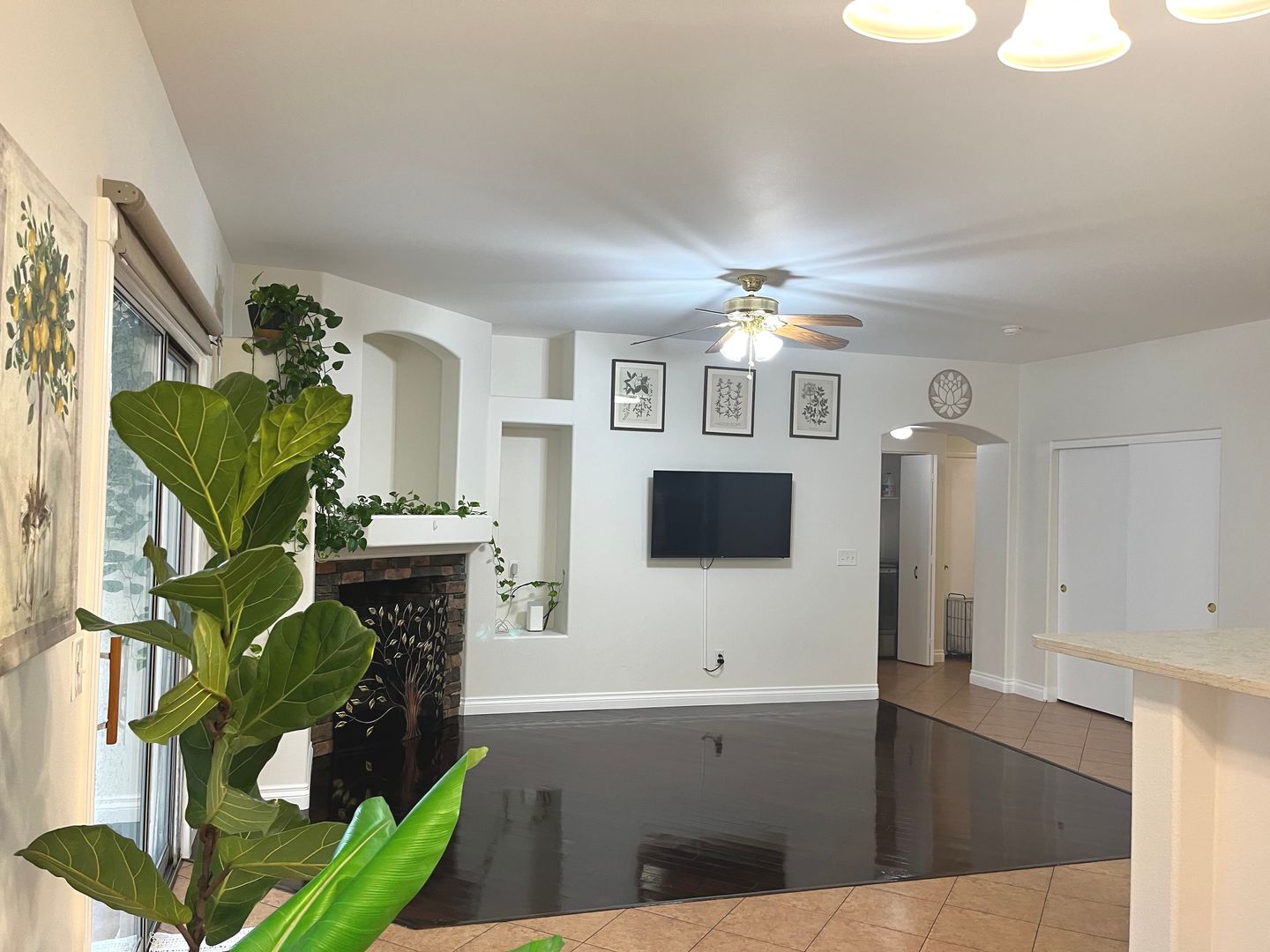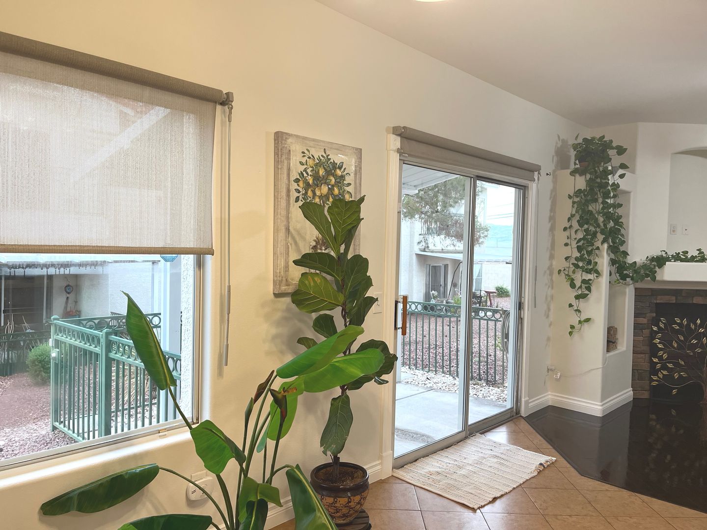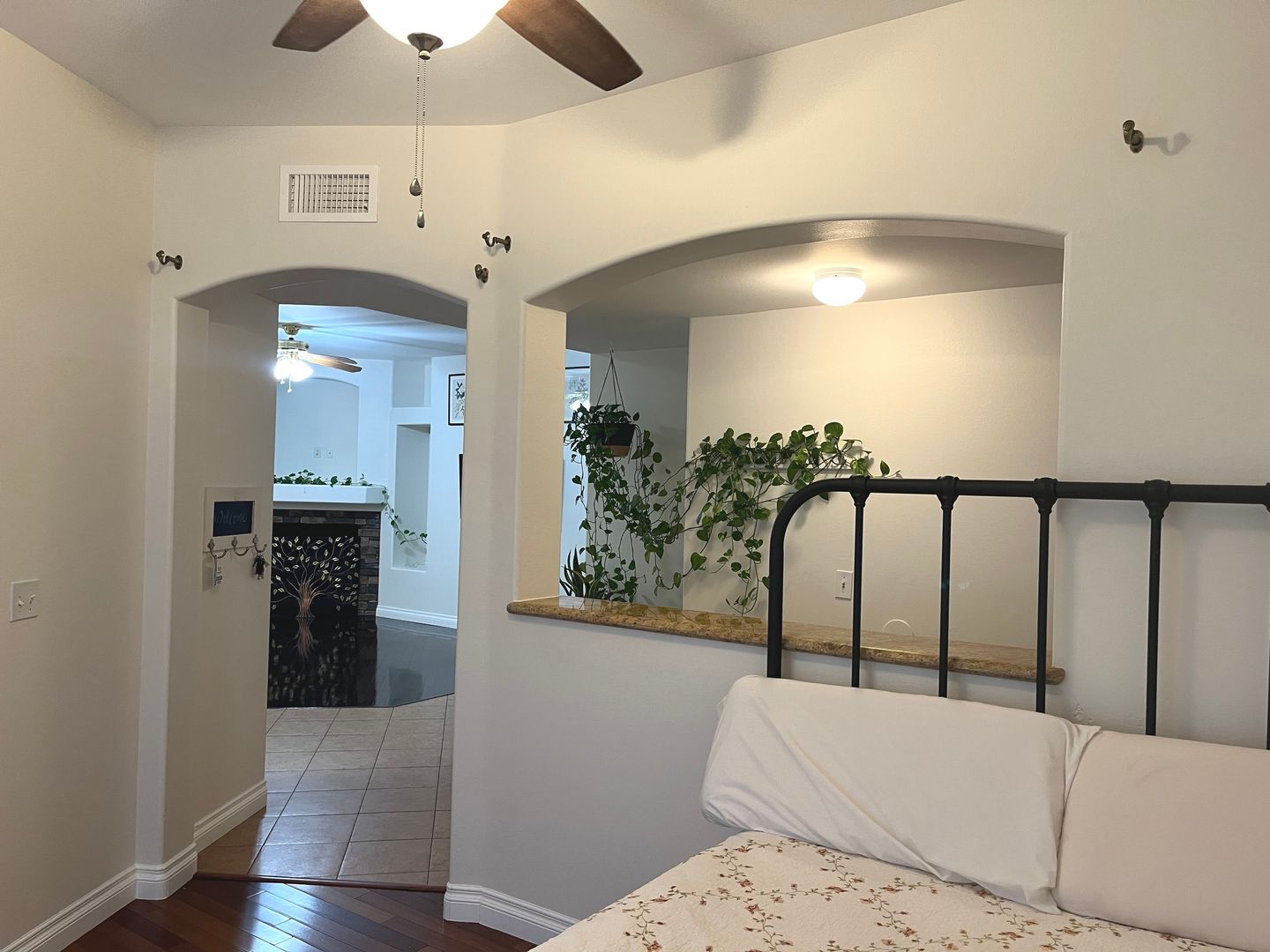 Advertised rent includes all monthly fixed charges. Remodeled, first floor 1428 sq ft, 2 bed+ den, 2 bath, 1 car detached garage condo in gated community. AC & water heater were replaced in 2020 & house is newly painted. Kitchen w/breakfast bar w/granite counters, full granite backsplash, raised custom cabinets w/soft close doors & drawers, ceramic tile floors, new SS refrigerator, white stove µowave, walk in pantry & dining nook. Living room w/ceiling fan & light, wood laminate floors & brick niche w/slider to outdoor covered patio. Primary bed w/ceiling fan & light, wood laminate floors & walk in closet. Primary bath w/dual sinks, granite countertops, travertine tile backsplash, linen closet & tub/shower combo w/travertine tile surround. Bed 2 w/ceiling fan & light, wood laminate floors & closet. Bath 2 w/tile floors, granite counters & tub/shower combo w/travertine tile surround. Den w/ceiling fan & light & wood laminate floors. Covered patio w/concrete slab and wrought iron railing. Detached 1 car garage w/walkway to front door.